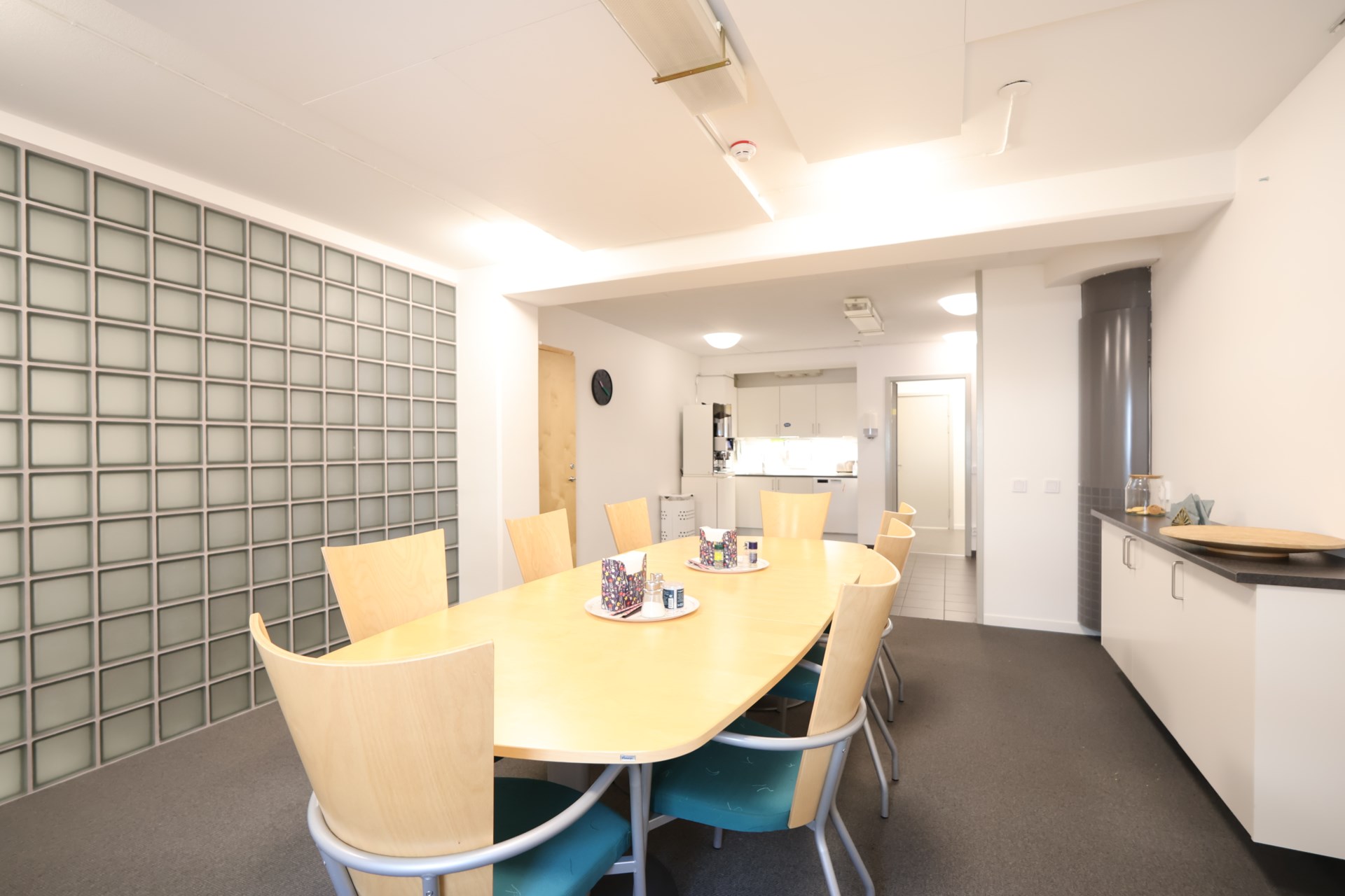 I lokalens hjärta finns ett trivsamt kök med pentry och sociala ytor som uppmuntrar till naturliga möten och pausstunder.