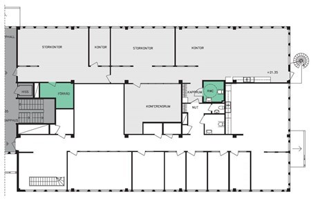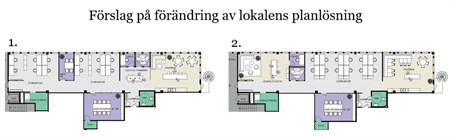 Lokalens planlösning går att ändra och vi har därför bifogat två ritningar med förslag på hur en eventuell ombyggnad skulle kunan bli.